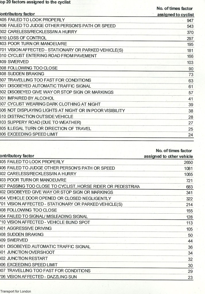 As TfL’s “Factsheet: Pedal cyclist collisions and casualties in Greater London: September 2011” states:” CFs are assigned to the participants of a collision by the police and can be highly subjective. They reflect the reporting officer’s opinion at the time of reporting and may not be the result of extensive investigation. Up to six factors can be assigned to a single collision; more than one factor may be assigned to the same road user and the user same factor may relate to more than one road user.”