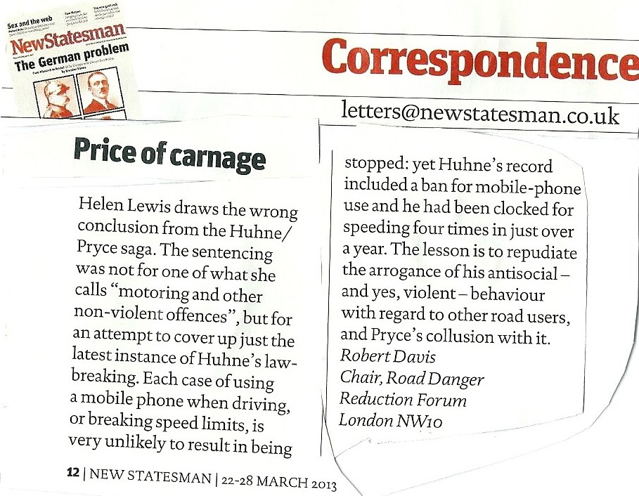 • Some of your correspondents (9 March) appear to regard such antisocial behaviour as trivial, deserving of “a fine and a wigging from the beaks”. Hardly an effective deterrent when Mr Huhne’s previous driving conviction and three-month ban didn’t appear to have much of an effect. Perhaps this case will encourage drivers to be more careful, and to avoid wriggling out of their obligation to accept minor penalties on the rare occasions they are caught.