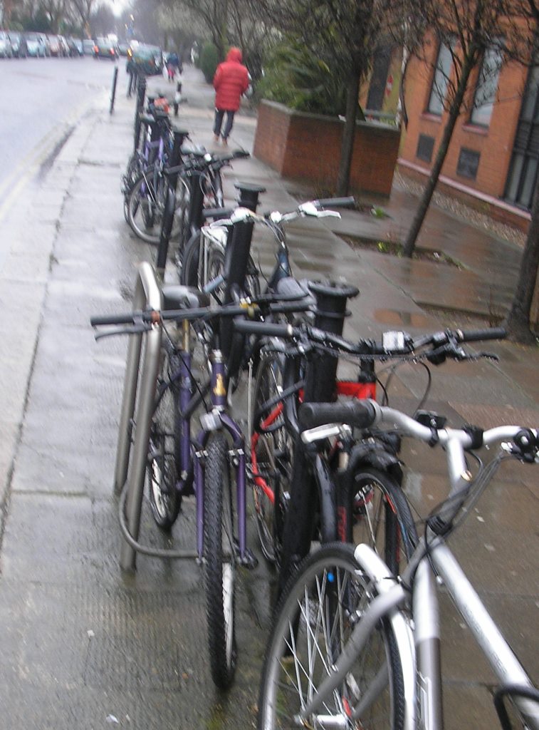 • Here is a row of cycle parking stands (see photo above) on which I have not seen one single bicycle since they were installed two years ago.  The idea was to have this investment as part of a programme of support for cycling which so far has not developed any significant support for cycling at all.