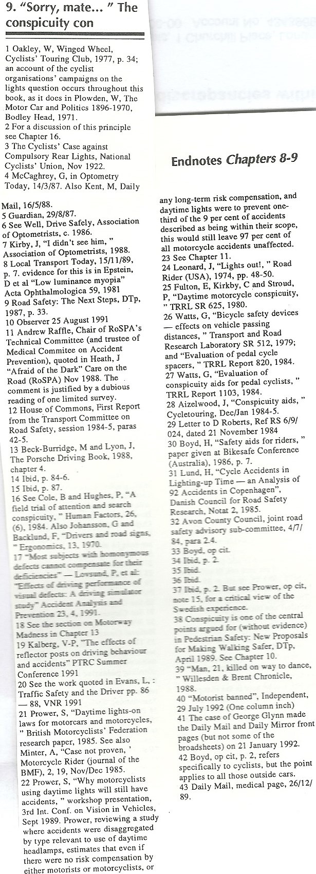 UPDATE: 24/04/2014- the scan below should now be readable! Below I post a scan of Chapter 9 from “Death on the Streets: cars and the mythology of road safety“. Since the subject of cyclist and pedestrian conspicuity has raised such interest, I took another look at the evidence for conspicuity aids such as h-viz clothing, and the context in which the advocacy of such items occurs. In the twenty years since publication, I am not aware of any fresh evidence which contradicts the conclusions to this Chapter, or the Precaution which I suggest is taken when considering advocacy of hi-viz.