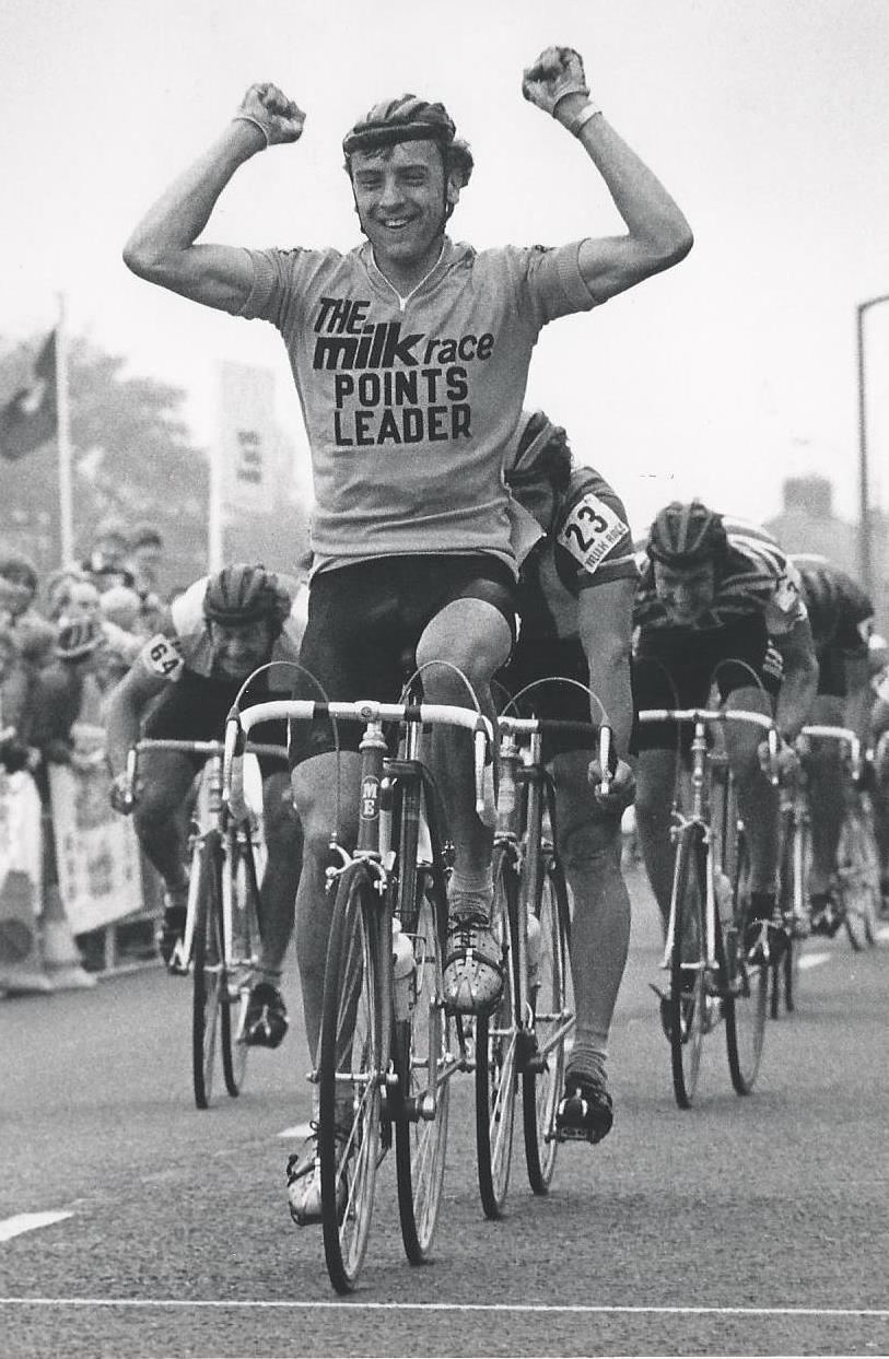 Malcolm Elliott wins a stage of the Milk Race in 1983, before shell helmets were worn, (note the “leather hairnet”)