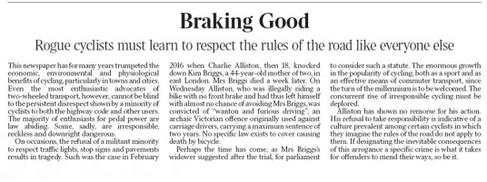 This post may seem a little late, based as it is on an Editorial in The Times from August 25th. Nevertheless, as with other comments arising from the Alliston case (here and here) its subject tells us some very revealing things about the way road user behaviour is either accepted or stigmatised by the society we live in. Any serious attempts to reduce danger on the road involve a proper conversation about what we should or shouldn’t tolerate in the road environment. So let’s take a look at The Times instruction.
