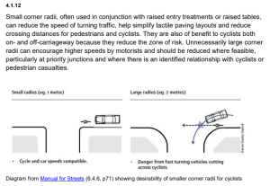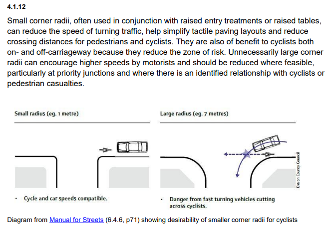 The most common conflicts resulting in serious injury to cyclists occur at side road or staggered junctions . London Cycling Design Standards and Manual for Streets state tight corner radii should be used in urban areas to reduce speed of turning traffic. “Designers should start from the assumption that corner radii should be minimised to benefit vulnerable road users, and then test whether this raises any issues.”