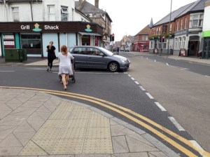 Figure 4: Newly constructed side road junction. Conventional geometry with slayed, wide junction, and ‘refuge’. Lack of priority and comfort contravenes aims of Equality Act by providing pavement-users with an inferior infrastructure/priority to carriageway-user