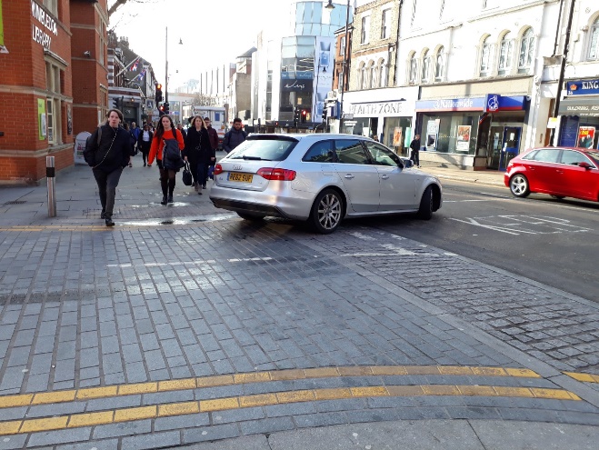 Figure 5: Blended footway: Despite the change in surface material and the raised table the visual priority is still with turning traffic due to kerb line and give-way markings. Wimbledon. Figure 6: Blended footway, Sutton. Despite the raised table, motorists still assume priority.