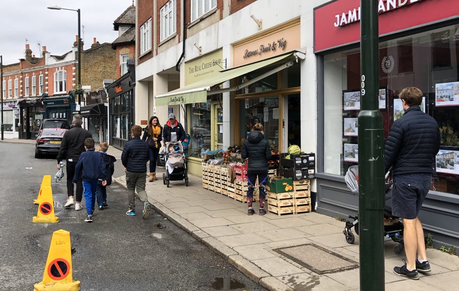 Richmond upon Thames (London) Barnes High Street SW13 The people involved say: ” Responding to public feedback, we’ve expended this initiative to other shopping parades. Cones have been moved a number of times to allow parking for blue budge holders. The Council are aware of the measures we’ve taken to allow residents to respect government guidelines.”