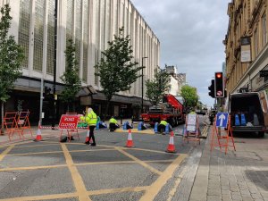 The Deansgate (particle closure) to motor vehicles is implemented, but here is how to NOT put “protection” in on a cycle lane: