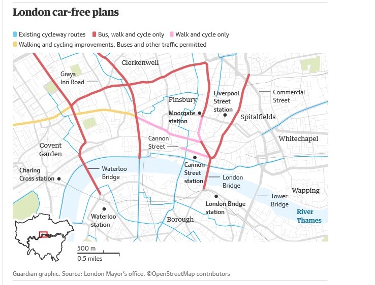 City of London Leading the way in various moves to reduce the dominance of motor vehicles. Plans (20th May) 3 further streets for consideration