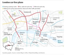 There’s an interesting graphic here – but do look in the bottom left hand corner to see that the area covered (where only a minority of travel is by car at the moment) is actually a small part of London. Some 10 miles of London’s 7,500 is covered – not that that has stopped taxi drivers and the Road Haulage Association from panicking with ill-informed prejudice in response.
