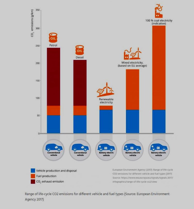 A crucial issue is what the energy source is: at present the UK grid has about half its electricity supplied by non-FF sources. We also have to consider the production, transport and disposal emissions involved in the life-cycle (“cradle to grave”) of EVs. So consider this illustration: